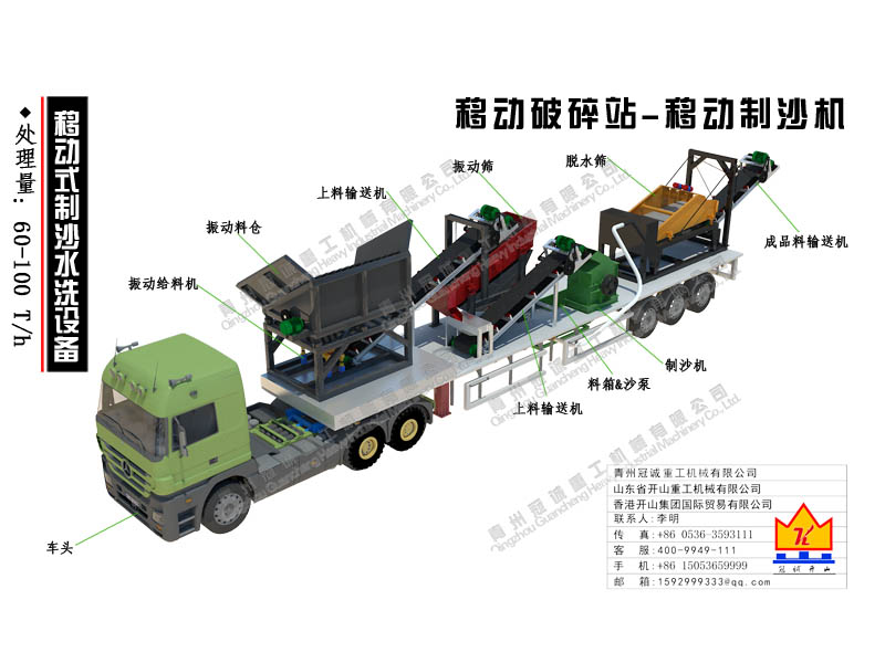 本套移動破碎站為移動式制沙水洗設備,處理量為每小時60-100噸,本移動破碎站是青州冠誠重工機械有限公司獨立設計制作而成,直接采用17.5米半掛車底盤改裝制作,其優(yōu)勢如下: